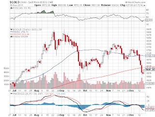 This brings us to our point of this article. Gold and silver. When the Fed and the ECB start "easing", gold and silver will shine again. They have shined since the start of the financial crisis and there is no reason to believe that will change. This latest downturn has created a potentially great buying opportunity. Many pundits are predicting gold at well over $2000 in 2012. In addition the gold and silver stocks have been hammered and are oversold giving extra leverage to any uptrend in the metals. Below is the spot gold chart.